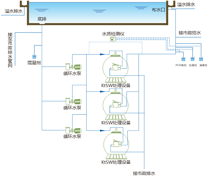 游泳池池水的循環(huán)過濾消毒就是其水處理工藝流程,游泳池池水處理的特點是循環(huán)過濾,其設計要點是循環(huán)水流量和循環(huán)周期問題,還有給水口、回水口的分布以使均勻布水問題,死水區(qū)和短流的問題。