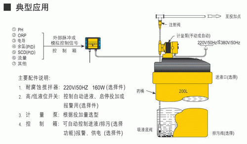 銀江自動(dòng)加藥裝置時(shí)以一個(gè)專用中央控制器為核心,并配置1-3只藥桶、攪拌器、液位器、計(jì)量泵、檢測探頭、電磁閥及其他外部信號(hào)輸出設(shè)備等構(gòu)成。以循環(huán)冷卻水的電導(dǎo)率只為檢測對象,通過測定循環(huán)水的電導(dǎo)率值來衡量水質(zhì)質(zhì)量,發(fā)出加藥、排污信號(hào),并通過外部設(shè)備完成加藥、排污,從而實(shí)現(xiàn)系統(tǒng)的自動(dòng)運(yùn)行,在實(shí)現(xiàn)殺菌滅藻、阻垢、緩蝕的同時(shí)保持水體一定的濃縮倍數(shù)。主機(jī)及主要部件均采用原裝進(jìn)口產(chǎn)品。