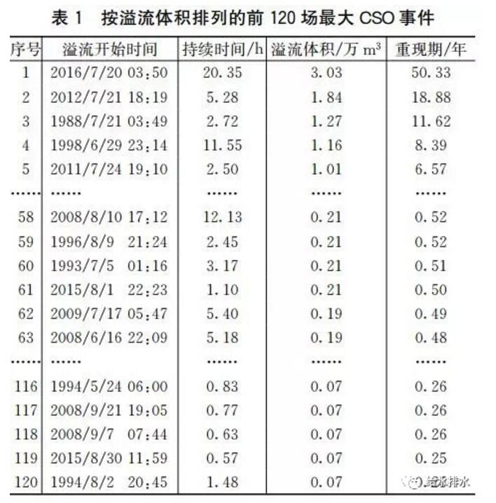 按照溢流體積從大到小將CSO事件進(jìn)行降序排列,并選取前N場(chǎng)最大CSO事件,N=βm,其中,β為每年選取CSO事件的個(gè)數(shù),按年多個(gè)樣法,本案例β取值為4,m為模擬年數(shù)30年。每場(chǎng)CSO事件溢流體積對(duì)應(yīng)的重現(xiàn)期T=(m+1-2α)/(i-α)[9],其中i為CSO事件按溢流體積從大到小排列的序號(hào),α為權(quán)重因子,取04,計(jì)算結(jié)果如表1所示,其中,重現(xiàn)期T也可根據(jù)式T=(mβ+1)/iβ計(jì)算。