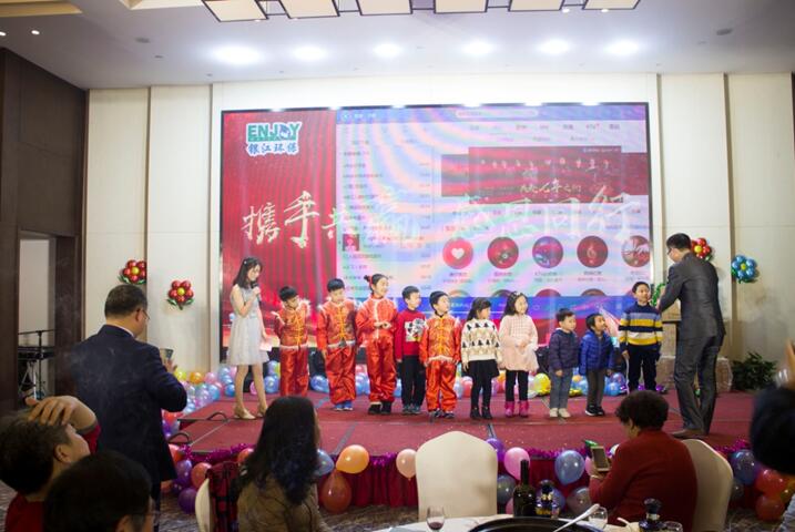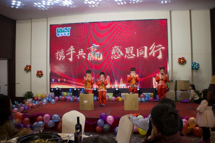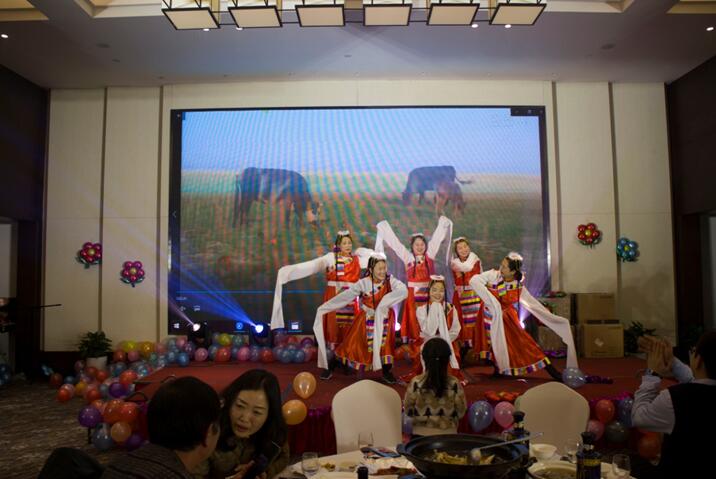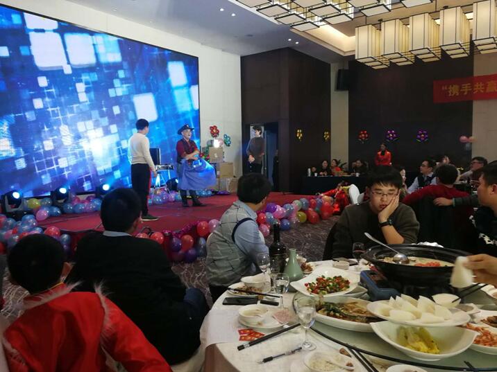 晚餐和文藝節(jié)目同時進(jìn)行,舞蹈《C哩C哩》拉開晚會序幕,銀江吉祥寶寶如意也閃亮登場。隨后,歌曲、彈唱、藏舞、合唱、三句半、魔術(shù)、游戲、抽獎、優(yōu)秀員工頒獎等穿插進(jìn)行。