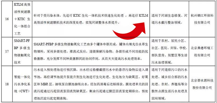 技術(shù)目錄顯示,來(lái)自北控水務(wù)的城鎮(zhèn)排水系統(tǒng)智慧運(yùn)營(yíng)管控平臺(tái),北排集團(tuán)城市污水好氧高密度微生物顆粒技術(shù)和基于厭氧氨氧化功能菌群優(yōu)化的污水處理新技術(shù),桑德環(huán)境的SMART-PFBP 多級(jí)生物接觸氧化技術(shù),碧水源的“MBR-DF”雙膜技術(shù)和智能一體化污水凈化系統(tǒng)(CWT),銀江環(huán)保的KtLM+KtIC一體化組合工藝等21項(xiàng)水污染防治技術(shù)位列其中。