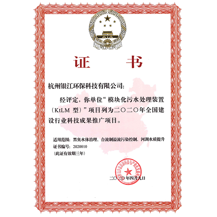 該技術(shù)在住房和城鄉(xiāng)建設(shè)部科技與產(chǎn)業(yè)化發(fā)展中心主持召開“模塊化污水處理裝置(KtLM型)”科技成果評(píng)估會(huì)上 評(píng)估委員會(huì)專家一致認(rèn)為:該項(xiàng)目開發(fā)的與MBBR工藝相結(jié)合的浮選沉淀工藝具有創(chuàng)新性,達(dá)到國內(nèi)領(lǐng)先水平,同意通過評(píng)估,并列入2020年全國建設(shè)行業(yè)科技成果推廣項(xiàng)目。