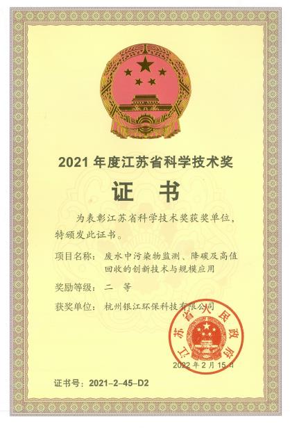 銀江環(huán)?!稄U水中污染物監(jiān)測(cè)、降碳及高值回收的創(chuàng)新技術(shù)與規(guī)模應(yīng)用》獲2021年度江蘇省科學(xué)技術(shù)獎(jiǎng)二等獎(jiǎng)。